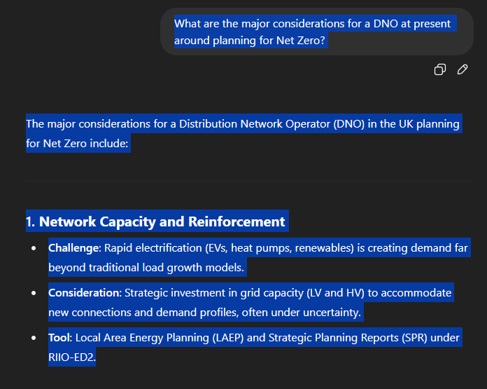 | What are the major considerations for a DNO at present around planning for Net Zero? ChatGPT said: The major considerations for a Distribution Network Operator (DNO) in the UK planning for Net Zero include: 1. Network Capacity and ReinforcementChallenge: Rapid electrification (EVs, heat pumps, renewables) is creating demand far beyond traditional load growth models. Consideration: Strategic investment in grid capacity (LV and HV) to accommodate new connections and demand profiles, often under uncertainty. Tool: Local Area Energy Planning (LAEP) and Strategic Planning Reports (SPR) under RIIO-ED2. |