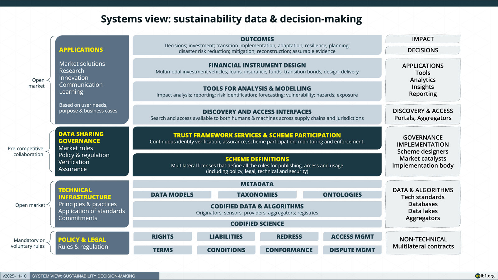 This diagram shows how sustainability data can flow through a (NOVA-aligned) structured, governed market to enable trusted decisions. It begins with raw inputs and ends with real-world outcomes, and maps the various steps in-between, including how the sharing of data is governed.